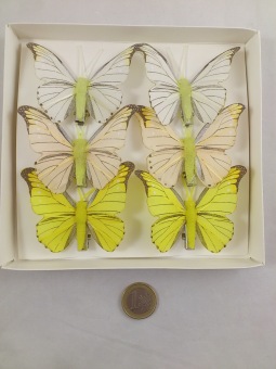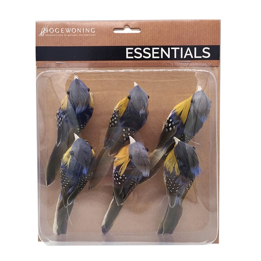 Vogels blauw geel met echte veren op clips 6 st.